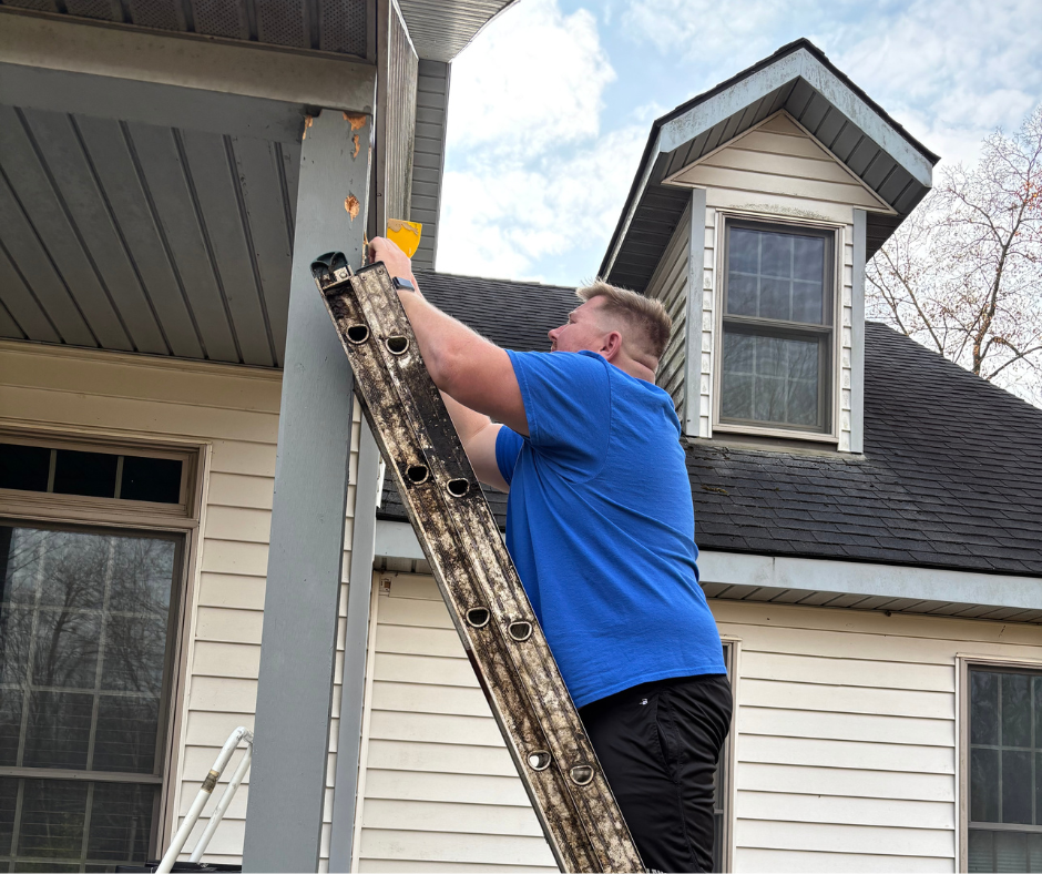 If you’re wondering why I’m up on this ladder, tools in hand, here’s the story. Jennah and I were helping one of our sellers prepare their beautiful country home for the next owners. As we walked around, they pointed out their front porch post—a favorite target of the local woodpeckers. The post was riddled with holes, and they felt awful about leaving it like that.